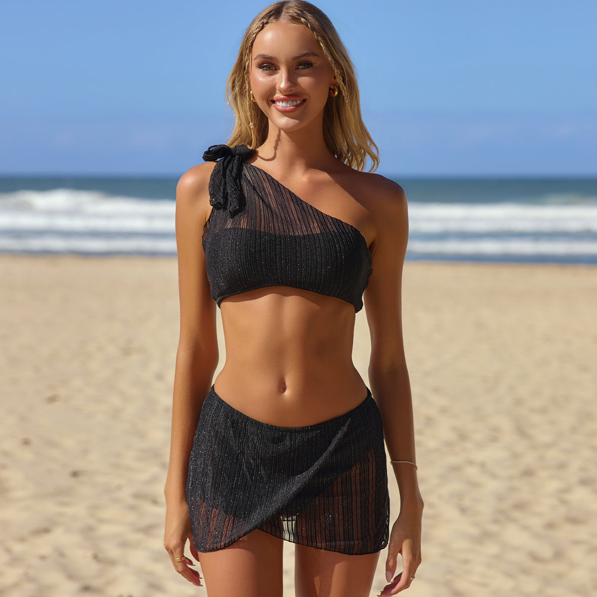 - One Shoulder Mesh Patchwork With Skirt Bikini Set